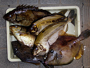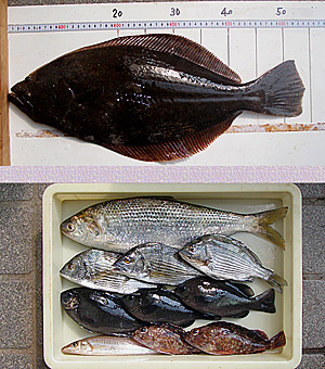 亀崎 鮎も終わり台風で家に引きこもっていました。台風一過、これからは海へと繰り出す予定ですが渡船を使った磯釣りは毎日は行けない。毎日釣行できる近場の釣り場はどこかな? 和田島、出島、辰巳、中林、などあるが昔にアイゴを釣った亀崎に行ってみる。家から10分、楽です。 福村の磯でアイゴが釣れているらしいので亀崎でも釣れるだろうとの予測です。那賀川の濁りが残っている状態なのでアイゴは期待できないと思う。しかし何かは釣れるだろう、開始早々からウキが消し込む。 なんとキスゴだわ。ウキ下が深いのかなあ、まあいいや、ガガネも釣れるしコノシロ、グレ、コッチンも釣れる。そんなときズンと重いアタリが、尋常ではないアタリ、大型チヌではない、アイゴでもない、ハタの類かな思ったが水面に浮いたのはヒラメ。大きいわ、近場でこんなのを釣ったのは初めて。オキアミに喰って来た。口の前にオキアミが行ったのだろうな、まあ偶然とはいえラッキーな獲物でした。 写真上は53cmのヒラメ、下は多彩な獲物です。写真のサイズが上と下で違っています。コノシロは酢味噌、他の小物は3枚に降ろして天ぷらにしました。ヒラメはもちろん刺身です。美味い、旨い、うまい、ぬるめに燗をした日本酒にぴったり、飲み過ぎたけど、明日も酒の肴を調達に行こう。 | ![]() |
