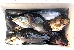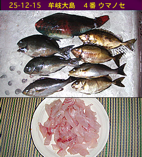 牟岐大島 4番 ウマノセ 息子に誘われたが釣れそうでないし寒そうなので辞退する。しかしそんな時には釣れるとしたもの。息子が上がったのは4番のウマノセ。朝からポツリポツリだが何とか釣れている。不思議なことに今日はキツの姿が全く見えなかったそうです。 グレは口太と尾長を1匹づつ。イサギ2匹、アイゴ3匹、ゴンタ1匹。下の写真はこれら4種類の刺身です。敢えてごちゃ混ぜにして皿に盛りました。新鮮なので区別が難しいようですが、でも分かります。一切れずつ食べながら、これはグレ、これはゴンタ、などなど。 調理中に1番身が締まっていたのはゴンタ、鋭利な刺身包丁でゴリッと言う感じ。この感触だけで美味そうだわ。1番柔らかいのはイサギ。まあそんなもんでしょう。 食べてみて、一番身に味があるのはイサギ、ないのはゴンタ。一番箸が進んだのはアイゴ。今が旬のグレは存在感はあまり無かった。 総合評価としては、1位は何たってアイゴ、最高です。他は?・・・グレも美味いけど、イサギも美味い、ゴンタの歯ごたえは絶品。まあ、どれも美味い、酒は月桂冠、熱燗ですな。 | ![]() |