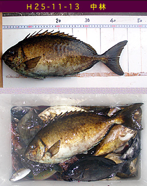 中林 中雀 天気予報では晴れ予想、しかし早朝から冷たい雨が降っている。行こうか止めようか、どうしようかと迷う。まあ中林なら近いし、イヤになればすぐに帰れるので行くことにする。 釣り客は5名。抽選です。先日の由岐では10名中10番、翌日は13名中13番、そろそろ1番が来るだろうと確信していた。本当、1番だった。確率論は正しい。 好調の中雀へ、東が良いのだが「足場は悪いでよ」と船長さんから変な心配をされる。年寄りだから仕方ないかと足場の良い胴に上がることにする。雨の中、釣りやすい所がいい。コマセを撒くと一面オセンの群。まあこんなもんだろう。数投目でウキがゆっくりと沈む。アイゴのアタリが来た。カンカンと心地よい引きは大好きだ。28cmの小型だが嬉しい1匹だ。 雨も止み陽がさしてくる。中林の湾の中にある雀磯は風を避け快適。ほぼ1投ごとにウキは沈む。ほとんどがオセン、アジが回遊してくればアジばかり。小型のイシダイ、グレ、ベラ、ガガネ、カワハギ、ウマズラ・・・などなど水族館なみ。 午後を回ったときズシリと重い手応えがくる。底ではない、ギューンと締め込む引きはグレのようにシャープではない、チヌか、いやチヌならギラリと光る、チヌではない。重い、ウキが見えてから何度も締め込む。正体不明。 ガバッと浮いたのはアイゴだった。それも大きい。これだけの大きさになればカンカンと独特の引きはないのかの知れない。浮き上がるまでアイゴとは全く思わなかった。 港に戻ると近くにいた5〜6名の漁師さんが集まって来た。「これは大きいわ」「中林にこんなのがいるんだ」「舟磯で40cmは見たことあるけんどなあ」などなどワイワイガヤガヤ。船長さんが計測すると45cm。「中林磯の記録ではないかな」とは船長さんの言。私自身のアイゴ記録魚かも。楽しい一日でした。 | ![]() |