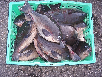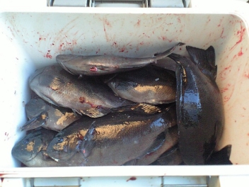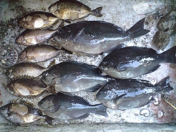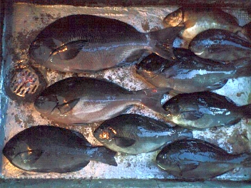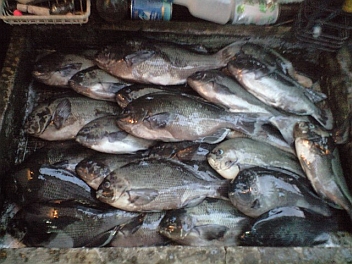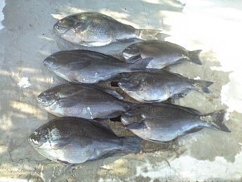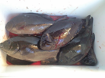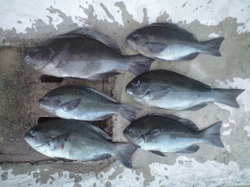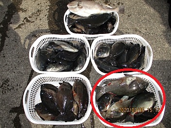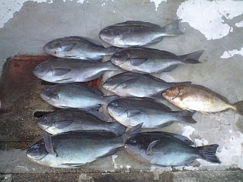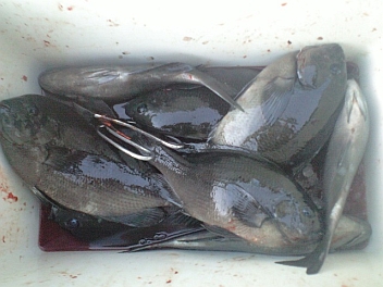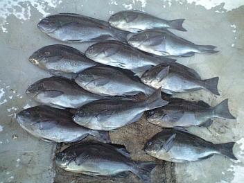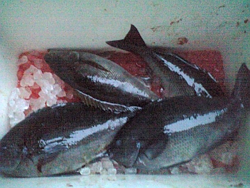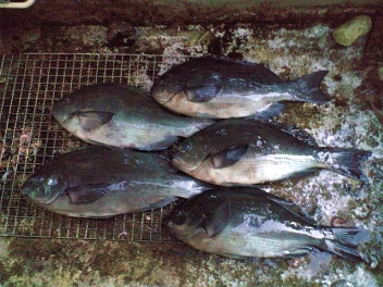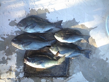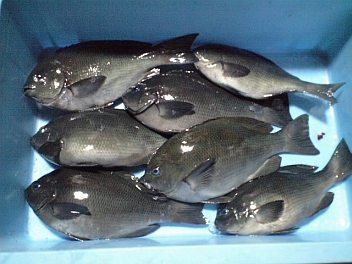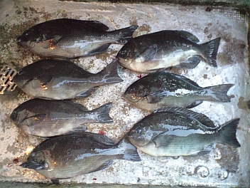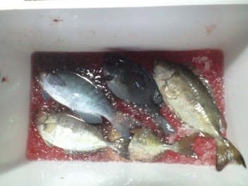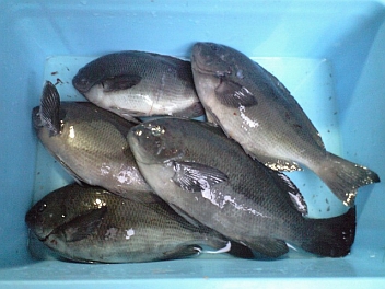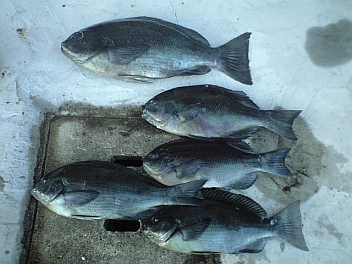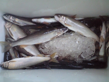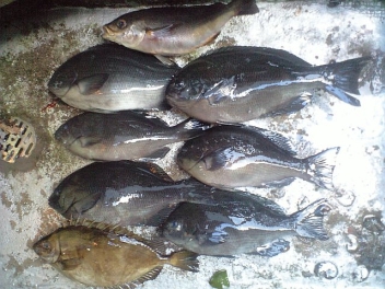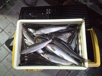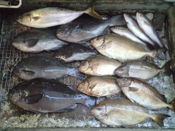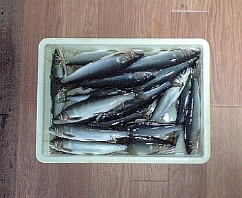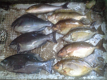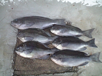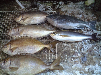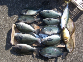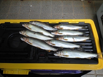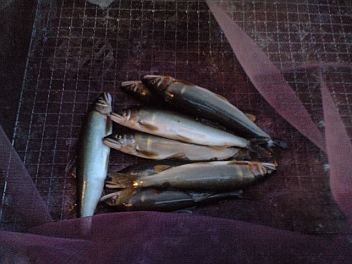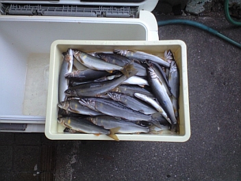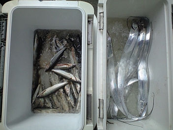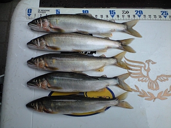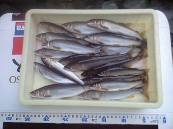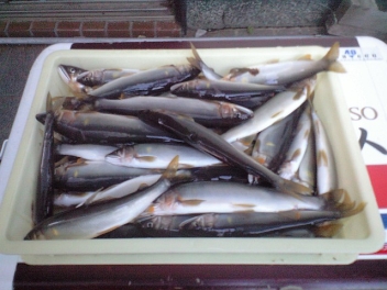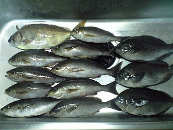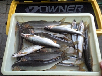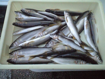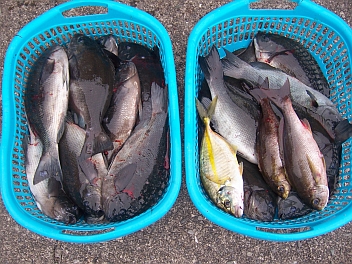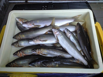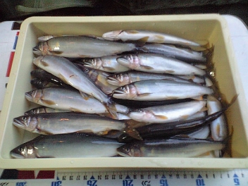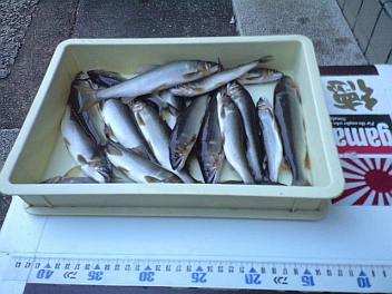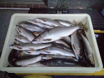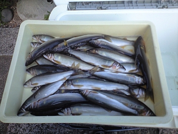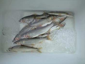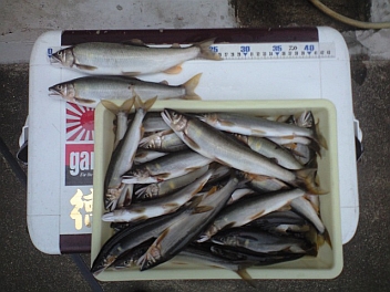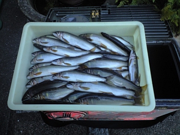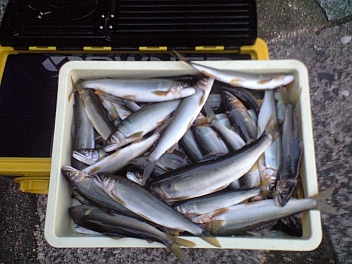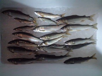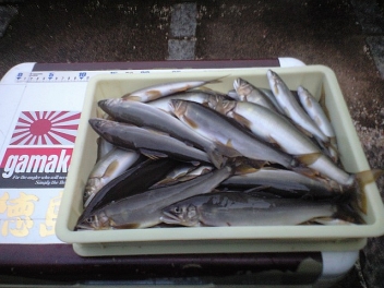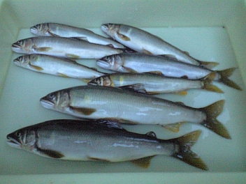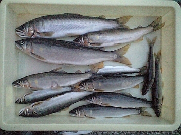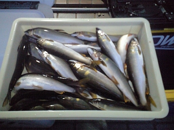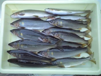 勤務明け二日目、野上橋に行ってみる。状況はよくないが、泳がせてみるといきなり目印が吹っ飛ぶ!え!?あっという間に1匹GET。2匹目もGET。全部背掛かりで明日の囮確保となる。 勤務明け三日目、昨日の場所で始める。時間は9時ぐらいか・・。10時までに5匹GET。 勤務明け四日目、今日は仮眠を取って、じっくりやってみるが、昨日のようにすぐには掛からない。しかし時間が経つにつれて、対岸のテトラ付近を泳がせていた時にガツン!石場と砂地の境目でガツン!日陰になっている場所でガツン!陽が照っている時はよかったのだが、天気は下り坂・・・。雲が出てきてからは掛かりも悪くなり、風も強くなってきたので15時に終了。21匹でした。明日は雨模様、さてどうしようかな。写真は釣果の一部。 | ![]() |