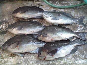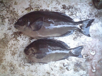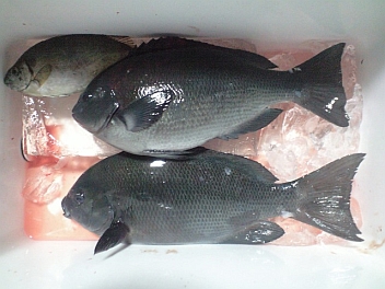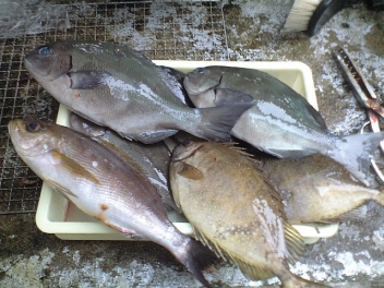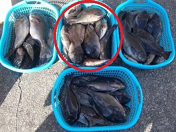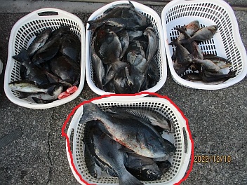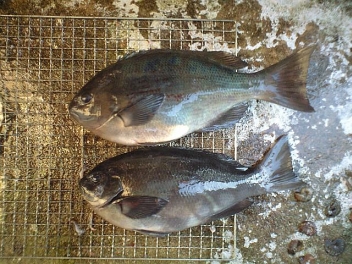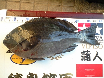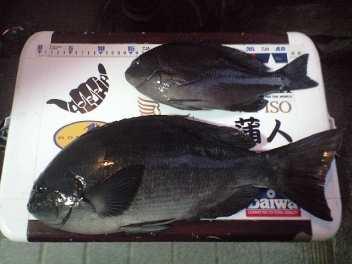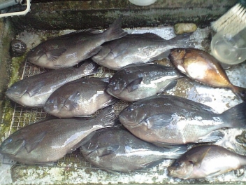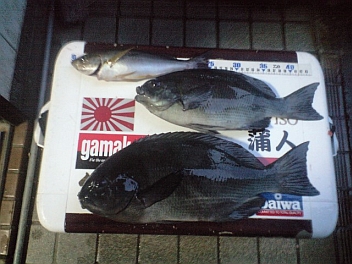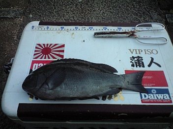 早い下り潮で水温低下・・・。13度台でかなり厳しい状況ですが、職場の釣り大会なので行ってきました。抽選場に行く前、水温を確認するため、大島を一週。すると、8番あたりから水温が15度台に、今日は佐本やりたいな〜と相方A君と話していると。A君船内クジ1番、船クジ9番、相方A君と一緒にオシドリです。A君は先端で、僕は屋形との間で釣り開始。開始早々A君イサギGET、これはけっこう期待出来るのちゃうかなと思い続けていると、沈ませ気味のウキがスッと海中に引き込まれまれる。きた!今日の最初で最後の貴重なアタリかもしれないので、慎重に取り込みし39cmのグレでした。その後は水温が上昇したのか、キツが撒き餌に舞ったり、そうかと思うと全く魚の姿が確認できない時もあったりで、厳しい状況が続きました。終わってみるとグレ2匹。A君グレ2匹、イサギ2匹でした。船に乗って水温計みてみると、なんと18度。前日から5度近く上がっていました。また2.3日すれば良い感じになるのではないでしょうか。また来週行ってきます。 | ![]() |