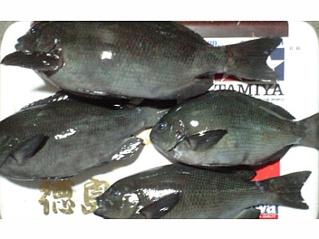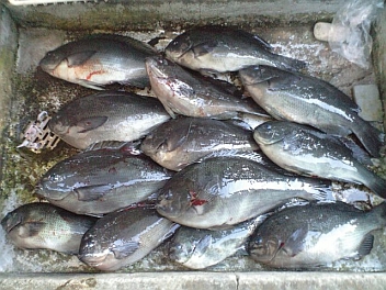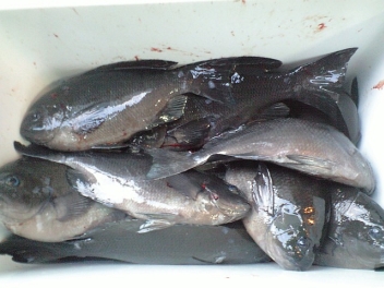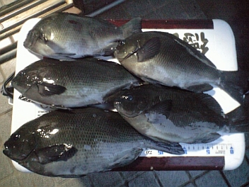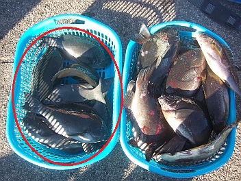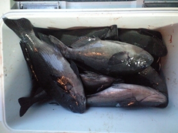 牟岐大島 屋形東 今日は爆風予報。佐本へ向かう船は少なく、10番から磯付け開始し、9番回りへ。そして屋形へ降りる。どこでもどうぞと優しい言葉に甘えて、屋形東で開始!1投目2投目は反応無しだが、よい感じで仕掛けが張れてるのがわかる。これは喰うぞと3投目に道糸にアタリが出て心地よい重量感、良型間違いなし!で1匹目は45cmクラスでした。その後も右方向への引かれ潮でポツポツ追加して屋形東を満喫しました。32cm〜44cm 14匹 | |