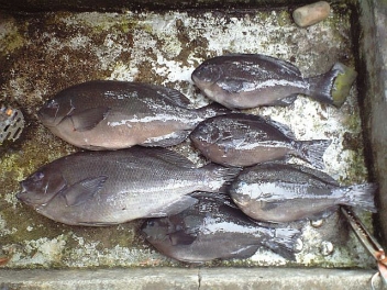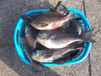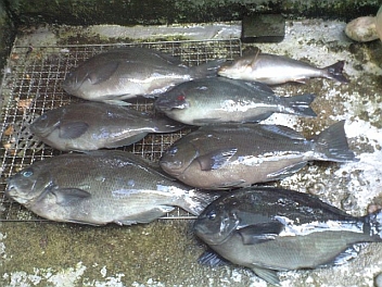 水温16度、けっこう期待して上がったのだが、大バエ方向から突いてくる当て潮に悪戦苦闘・・・。磯際で食わすも竿を立てる間もなくフワッと軽くなる。仕掛けを回収してみると、スパっとハリスが噛み切られている、たぶんキツでしょう。撒き餌をすると底の方でチラチラと魚が見え隠れしているのが確認できる。キツが釣れるのなら、そのうちグレも来るだろうと思っていたのだが、餌は残ったまま。当たってきてもいい感じなのに、う〜ん何かおかしい。ちょっと仕掛けが入るスピードが速いような感じがしたので、針交換・・・まだ速い。ハリスを1.2号から抵抗の少ない1号に交換。お!いい感じやなと思った瞬間、ウキがスッ〜っと引き込まれて。合わせるとズンと乗る重量感!この段階でグレと分る感覚。最高です。続いてすぐにアタリがくる。これも磯際。こうなってくれば徹底的に磯際狙いです。仕掛けの入るスピードに注意しながら、納竿までに30cm〜35cmグレ6匹。今日も1日楽しかったです。 | ![]() |