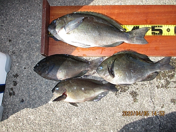 出船時から北東から東の風がけっこうきつい。これは佐本、裏周りはしんどそうやなぁ〜と思っていたら。桃オチに上がることとなる。開始1時間全く魚の気配なし。グレあきらめてイサギ狙おうかなと思っていたら、撒き餌にボラが舞いだし、黄色。茶色のエサ取りの姿も確認できる。ん?よ〜く見ているとグレらしき姿も確認できる。明らかに状況が変わったなと思っていたら、ウキがスッーと沈む。待望のグレがきた。桃オチは少し足場が高いので、ウキが吸い込まれていくのがよく見えて気持ちいいです。この後、少しパターンにはまって、1回目の見回りまでに5匹、2回目は9匹、昼前後は小グレ、キツが元気になり、四苦八苦・・・。昼1時を回って、潮が少し上りぎみになってからまたポツポツ追加して合計15匹。久しぶりの大島大満足です!これで冷蔵庫のエサもなくなり、6月からは鮎が待ってます。それまでに底物も行かないと・・・。 | ![]() |