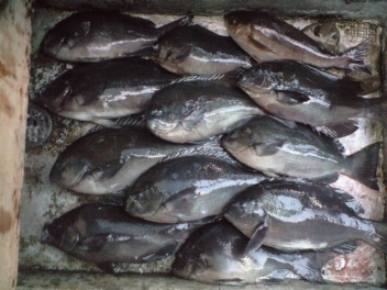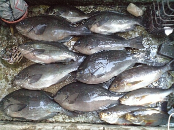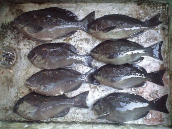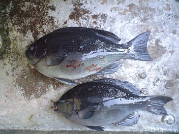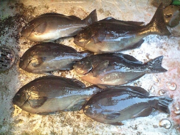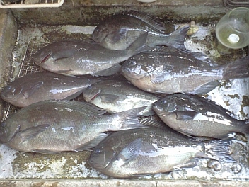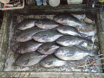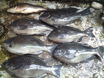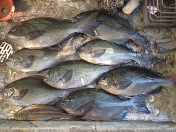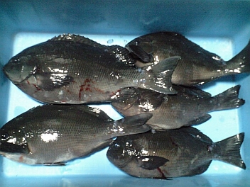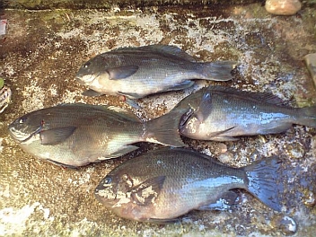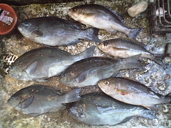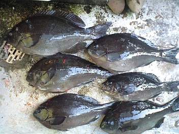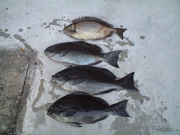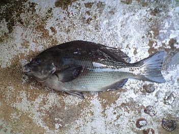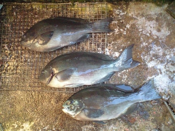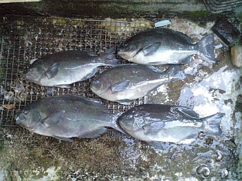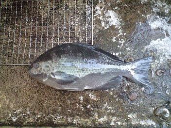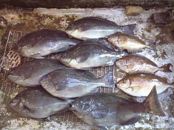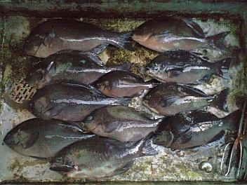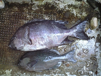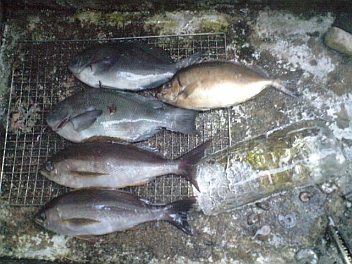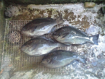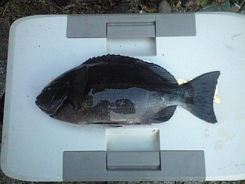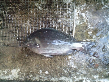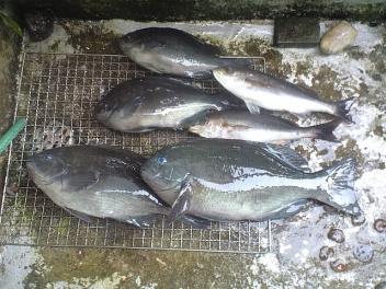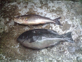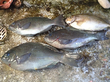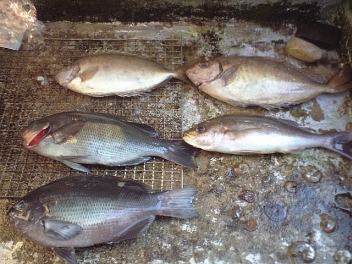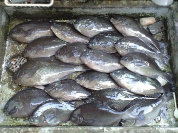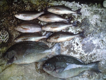 牟岐大島 高橋 あまり調子のよくない櫂投げ周辺だったが、高橋で快釣。開始して暫くはアタリなし・・・あっちこっちやってみたが、アイゴ。アイゴ。黄色みたいな・・。で、少しポイントを変えて左のシモリ際に徹する。撒き餌をしてみるとなにやらグレらしき姿もみえる。浅い棚からゆっくり入れていくとすぐにアタリ!グレであってくれよと・・・。何回か足元につっこまれながらも、上がってきたのは40cmクラスのグレ。ようやくポイントを見つけてそれからは連発することが出来た。満足満足。 | |