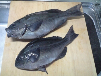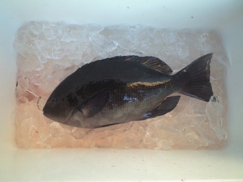 強風はある程度覚悟していたのだが、予想外の大波でした。表磯はほとんど使えず、上がったのはオハナの地。冷え切った手で針を結び、開始するも、西からの強風と大きなサラシで何がどうなっているのかさっぱり分らない状況・・・。海が静かになった時にようやくアタリがきました。竿先をコン!と叩くアタリ。あわせると良い重量感!強引にやりとりし、水面下に見えてきたのは真っ黒の居着きの40cmグレ。外れるなよ〜と思いつつ無事取り込み成功。この後、同じ感じでやっても全く当たらず・・・。次のがきたのは海の状況が変わってから、少し沖目の潮目を攻めているときに、飽きない程度にグレ、アイゴがポツポツと釣れました。アイゴ小さいけど干物にしたら絶品です。グレは父親がよく握り寿司にしていたのを思い出し、妻と2人で再現してます。釣るのもいいけど、料理するのも楽しいですね〜。また来週行ってきます。 | ![]() |