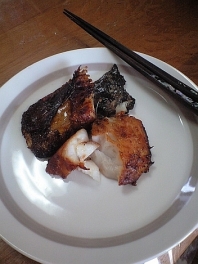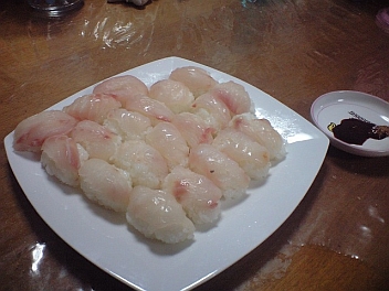 春一番の大風でおおきなウネリ。それでも水温さえあれば何とかなるのだろうが、裏周りは水温低下で、13度。いつ上げてもエサが残っているこんな状態がずっと続いてギブアップ。1時間前に撤収となりました。上物は3月末まで行く予定なのでそのうち釣れる日もあるでしょう。また次回に期待です。写真はグレの握り寿司 | ![]() |
