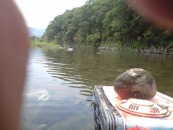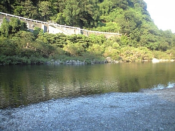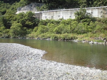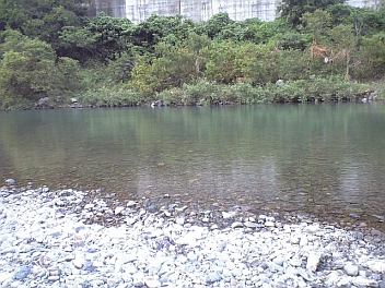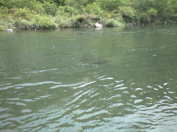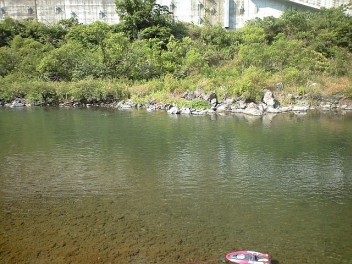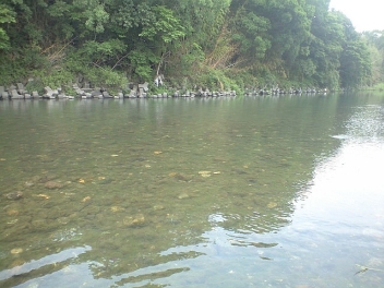 勝浦川 夏季休暇4日目 34匹 午後から用事があるので11時までの釣行、前日反応の悪かった深い場所はどうかとやってみたが今回も散発に終わる…。やはり浅い場所か…ならばと潜水橋の上へ移動する。ここでは型の良い鮎を5匹掛ける。ゆっくりと上流に登らせるとぽつりぽつりと掛かる。アタリが遠のいたので、少し上の開けた浅瀬で広くオトリを泳がせると、キラッと光りギューンとくる。この場所で掛かるようになると本調子。 | |