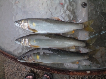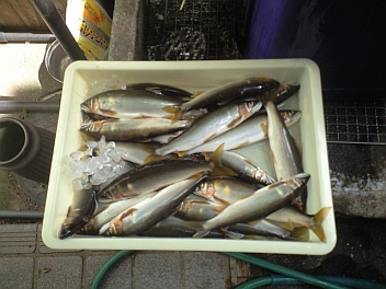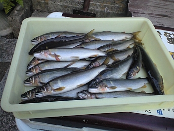 勝浦川 増水後 67匹 ここ最近、夕方になると西の方で夕立、水位も上下を繰り返し、本日ようやく落ち着いたか・・・。ならば掛かるだろうと、テラスから始める。す〜っと手前から囮を送り出し角度を調整して狙いのポイントへ入った途端、コンッ!と背掛かりの感触!ぐいぐい引っ張られ21cmの良型。次も21cm、20cmと良型が続くが、経験上このサイズが掛かる時はあまり数は伸びない。やはり16.17.18これが掛からないと本調子ではないだろう。結局、水温が上がりだした頃からこのサイズが掛かるよになり数を伸ばす事ができた。午後18時までの釣果。また明日や!今日掛かってないとこやってみる。 | |