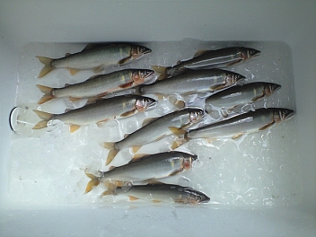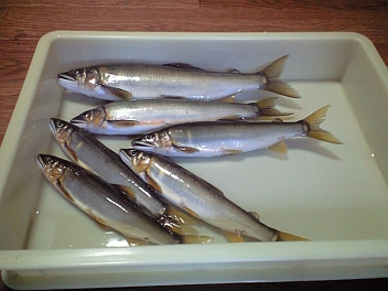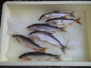 増水後、久しぶりの友釣り、少し濁りが気になるがやってみる。囮をセットし、ス〜ッっと泳がせて、数秒・・・トンッ!といきなり15cm。その15cmを泳がせて、ポツポツと飽きない程度に鮎が掛かる。が、今日は昼から用事があるので、11時に終了。10匹でした。また明日やってみよう。 | ![]() |