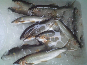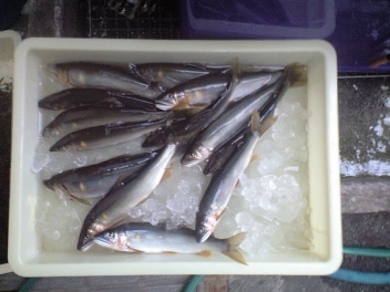 勝浦の解禁です。いつものメンバーでイナバ!朝5時30開始するも・・・昼前まで5人で3匹・・・。川の状況は悪いとはいえ、もう少し掛かってもいいのではないだろうか・・・。皆さん諦め、午後2時には終了しました。私は居残りで夕方18時までやって、結果15cm〜23cm 11匹。夕方少し掛かったけど、状況は悪いです。 | ![]() |