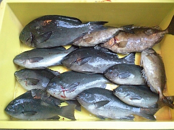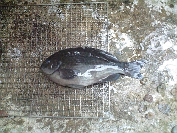 強風覚悟で先生を誘っての大島です。船クジ17番、桃オチ周辺に何人か下ろし、15番、16番を回って、櫂投へ、先行の船の磯付けが終わるのを待ち、タニハンに降りる。とりあえずいつもの仕掛けで開始。1投目・・2投目・・3投目でブィ〜ンと竿にくるアタリ!合わせると気持ちのいい重量感。1匹目慎重に取り込んで、35cm。その後続けるが全くアタリなしで餌も付いたまま。時間は過ぎて潮が左から右にゆっくり流れ出し、潮下を攻めていると立て続けにアタリを捉えるのだが、寄せてくる度足元で根ズレのラインブレイク・・・。ようやく取り込んだのは42cmの西海のような細長いグレ。その後、かろうじて1匹追加。う〜んなんとなく釣れた?釣った?感じの1日でした。先生はタニハンの地で5匹。見事!(家に帰り、早速1匹料理しました。子供たちが大島の魚は美味しいと喜んで食べてくれます。嬉しいですね。) | ![]() |