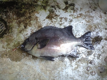 牟岐大島 沖富士 水温は十分。今回は沖富士へ上がる。あっちこっちやってみたが魚の反応は無く時間だけが過ぎていく、そのうち沸きグレが現われ楽しませてくれるが取り込んだのは1匹のみ・・・。残念。 | |