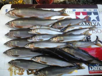 終日釣りができるので、気合を入れての釣行です。増水後二日目なので、掛かればいいかの気持ちでやってみる。開始20分、流芯で1匹目。まあまあのサイズこれが続けばいいのだが、やっぱり後が続かない2匹目が掛かったのはそれから30分後ぐらいか・・・。ペースの悪さに集中力もキープできず、午前中は9匹に終わる。昼休憩をすると、昨日ナグリをやったせいか、疲れがどっとでてきて、居眠り1時間。午後からは、午前中にやってないトロ場をやってみる。腰まで入ってるので底の状況は確認できないが、たぶん良い石があるのでしょう、縄張りを持った鮎が掛かってくる。至福の時間が過ぎていき、午後17匹。明日も行く予定ですが台風接近中、安全第一で!写真は釣果の一部15cm〜21cm | ![]() |